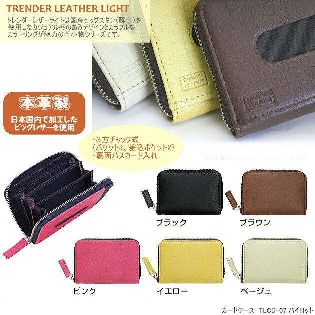 商品名 TRENDER LEATHER LIGHT トレンダーレザーライト カードケース 品番 TLCD-07 サイズ 約)横105×縦75×厚さ18mm 重さ約)50g 材質 ピッグレザー(豚革)、内側-ナイロン 仕様 3方チャック式カードケース 外側:指穴つきカードポケット×1、内側:ポケット×3、差込ポケット×2 メーカー コレクト株式会社 Suicaや定期などとよく使うカード、小銭などを収納携帯できるカードケース。